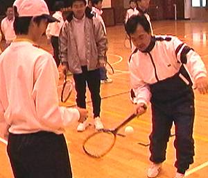 | 1 講義 何を目標にするか 競技スポーツ:より速く ・・・ミスしやすい より正確に ・・・遅くなる この矛盾したことを追求する。 リズムとバランスが大切 生まれ育って持っているものは直せない 意識させてはいけないことを意識させるとバランスを壊す。 自転車に乗るにしてもある程度のスピードでこがなければ倒れてしまう。 平均台でも倒れそうになれば自然に腕でバランスをとろうとする。 動きの中で自然にバランスを保とうとする力を信じて引き出してやることが大切。 原理・原則を大切にした指導を グリップ強く握らない方が速いボールが行く 二本の指だけでラケットを持っても打点の前後でコースの打ち分けができる。 ロブ:頭の位置を後ろに トップ打ち:頭の位置を前に |